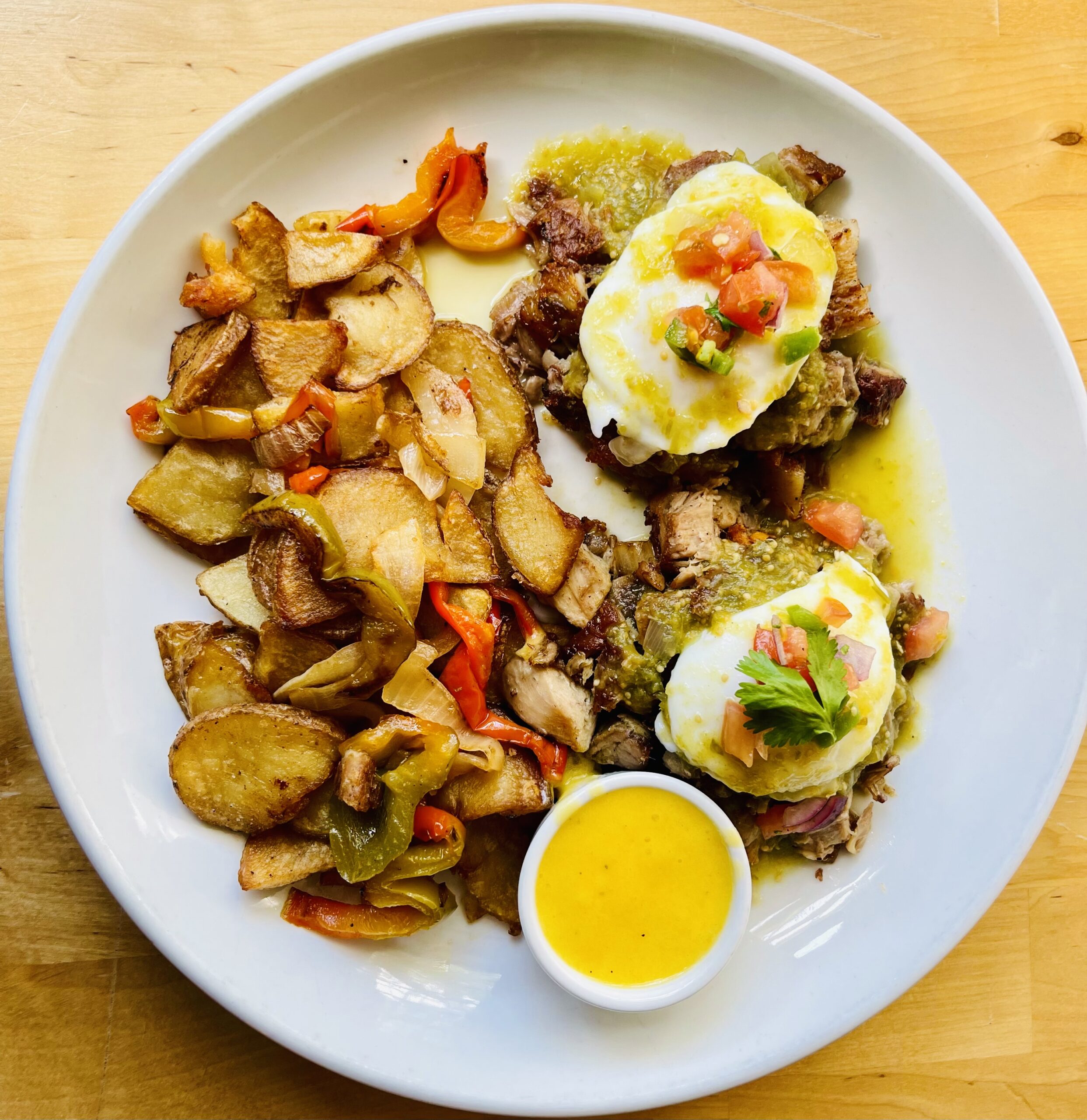 Ciabatta toast, confit pork, two poached eggs salsa verde, pico de gallo and hollandaise sauce.