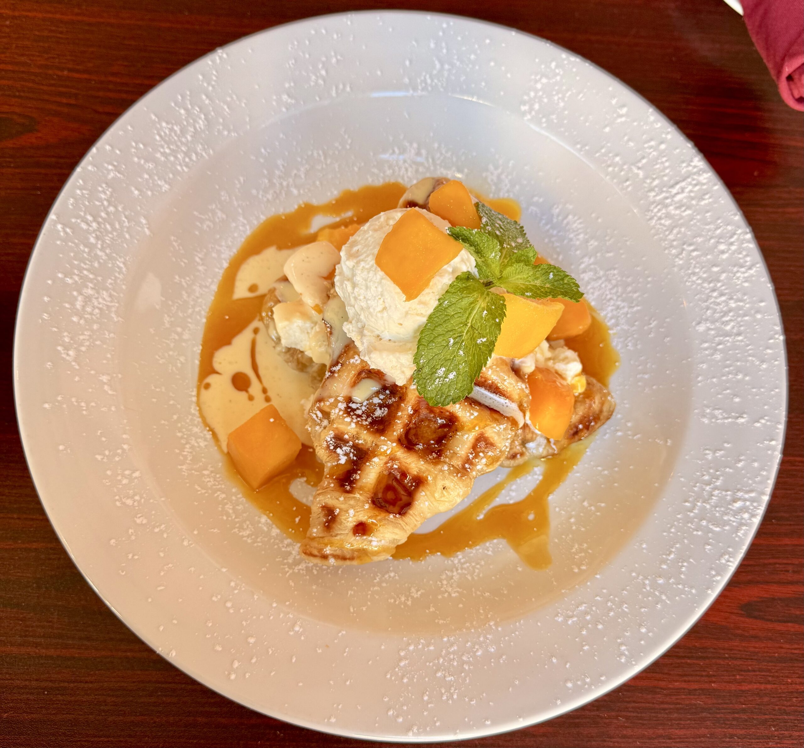 Croisant dough cooked on the waffle iron, topped with fresh mango chunks, mango syrup, vanilla anglaise sauce and whipped cream.