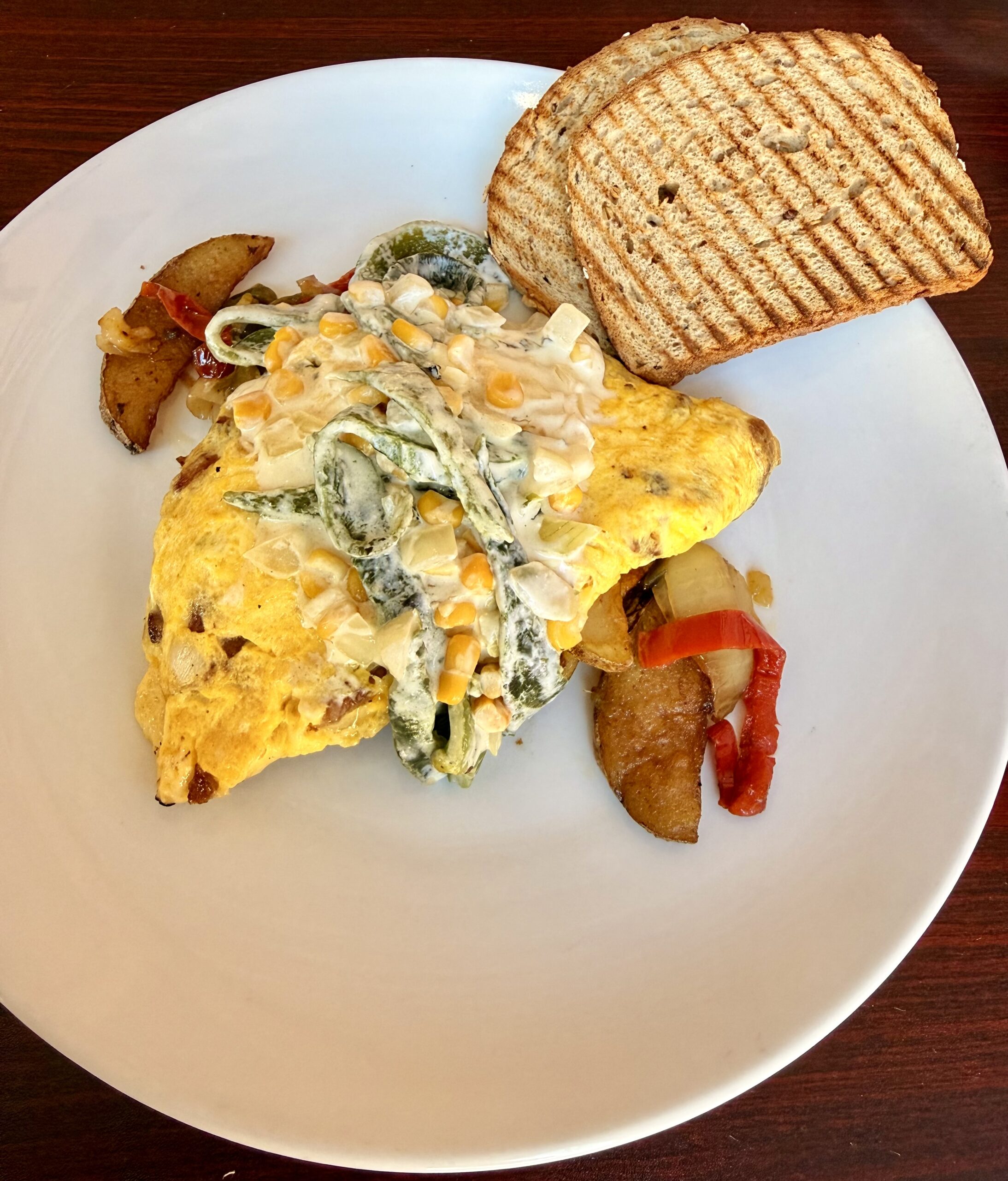 Bacon and onion omelette, topped with "rajas poblanas" (sauted roasted poblano peppers, onioons, corn and crema fresca) served with home fries and toast.