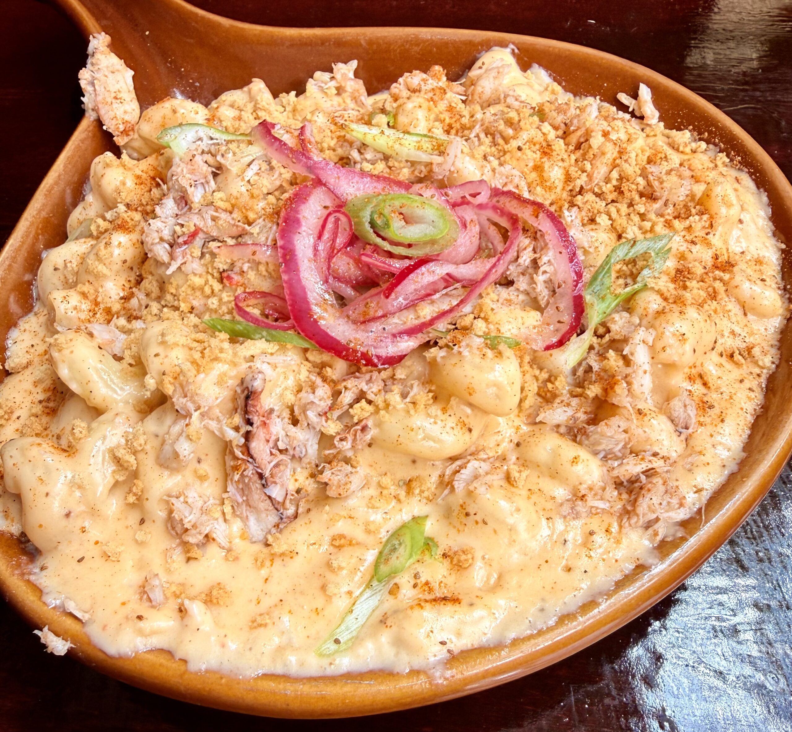 Homemade cheese sauce, cavatappi pasta, crabmeat, old bay seasoning, toasted panko, honey lemon aioli, scallions.